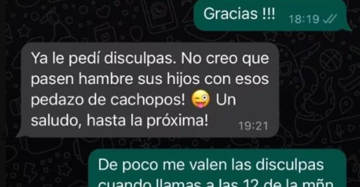 El cliente, lejos de mostrar arrepentimiento, le respondió al dueño del restaurante que ya le había pedido disculpas y que no creía que sus hijos pasaran hambre con los enormes cachopos que servía en su local. El dueño del restaurante le reprochó su actitud burlona y le dijo que sus hijos comían más cosas que cachopos.