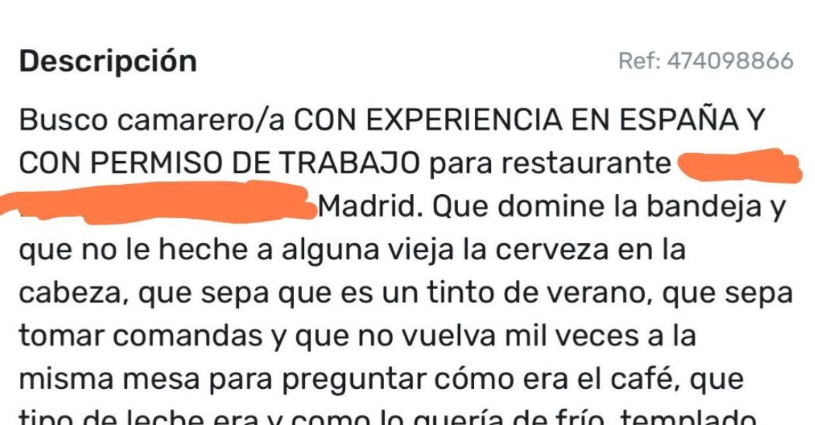 Indignación con la ofensiva oferta de empleo de un bar de Madrid: «Harto de impostores»
