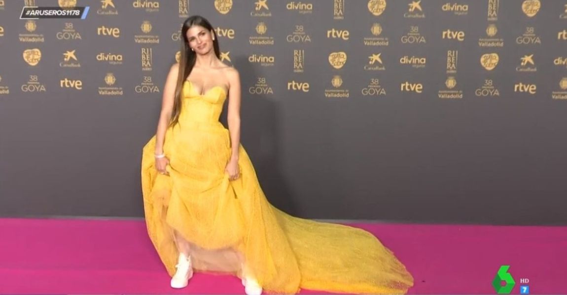 Una de las actrices que más llamó la atención fue Sara Sálamo, que optó por un vestido amarillo de corte asimétrico y escote ‘halter’, que combinó con unas zapatillas ‘converse’ blancas. La canaria sorprendió con este ‘look’ informal y desenfadado, que rompió con el protocolo de la gala.