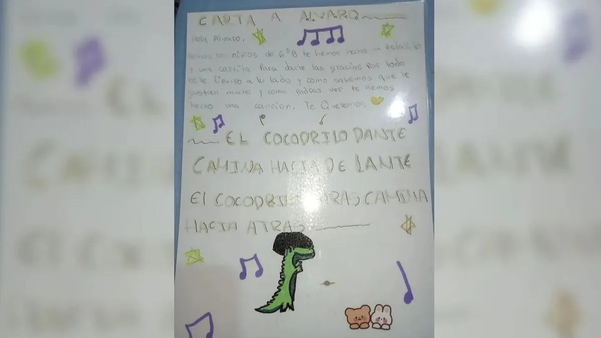 La clase de 6ºB, tras pasar un tiempo con Álvaro y conocerlo mejor, decidió expresar su cariño de una manera muy especial. Con entusiasmo y creatividad, redactaron una carta adornada con dibujos de estrellas y notas musicales, y la escondieron en la mochila de Álvaro como una sorpresa. «Te hemos hecho un detallito y una cartita», le comunicaban, revelando que habían compuesto una canción para él, sabiendo cuánto disfruta de la música. La elección no pudo ser más acertada, ya que Álvaro adora cantar y una de sus canciones favoritas, ‘El cocodrilo Dante’, fue la inspiración para este regalo musical que culminaba con un sincero «Te queremos», acompañado del dibujo de un corazón.