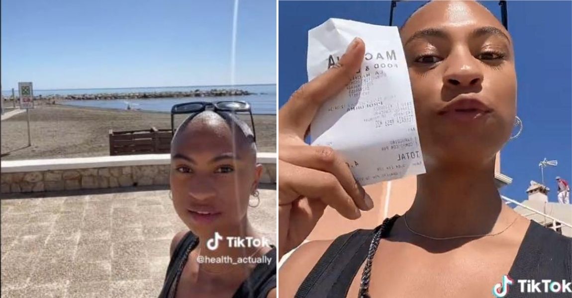 La joven usuaria estadounidense de la red social TikTok, @health_actually, ha publicado un vídeo donde se ha mostrado asombrada por el precio que le acababan de cobrar tras tomar un agradable almuerzo frente a una playa en España.